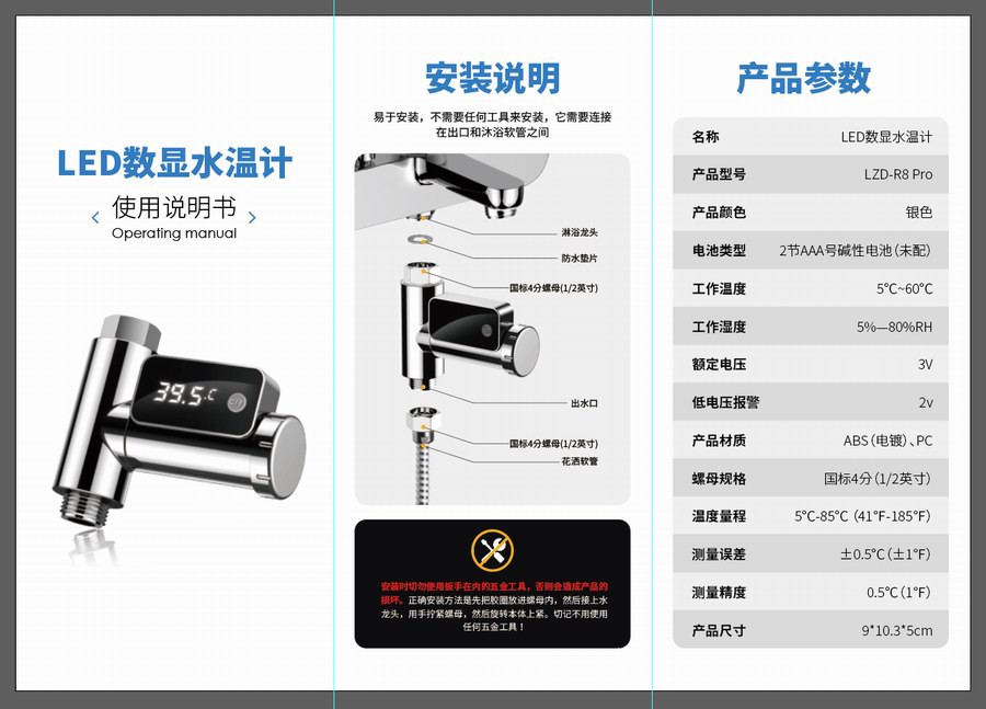 名称:LED数显水温计 产品型号:LZD-R8 Pro 产品颜色: 银色 电池类型: 2节AAA号碱性电池(未配) 工作温度: 5℃~60℃ 工作湿度:5%—80%RH 额定电压: 3V 低电压报警:1.6v 产品材质:ABS(电镀)、PC 螺母规格:国标4分(1/2英寸) 温度量程:5℃-85℃ (41℉-185℉) 测量误差:±0.5℃(±1℉) 测量精度:0.5℃(1℉) 产品尺寸:9*10.3*5cm 包装尺寸:长13.3x11x3.5cm 净重是:102g 产品毛重:160g 装箱箱数 装箱重量 |